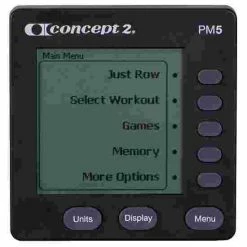 The Concept2 “RowErg” rowing machine features a display that shows the distance, speed, stroke frequency, calories burnt, wattage and heart rate (optional).