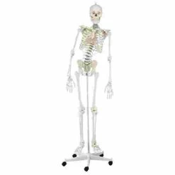 The flexible Erler Zimmer anatomical model “Hugo” is a natural casting of a human skeleton. The model is accurate and complete, showing all important details including fissures, foramina and processes. It features a movable spine, allowing you to demonstrate the vertebral positions in different body postures. The gliding joints in the shoulder, hip and ankle mean that the movements are realistic. Hugo’s arms, legs and feet can be removed, and his skull can be broken down into three parts. The Erler Zimmer anatomical model comes on a five-spoke roller stand, so Hugo can effortlessly be relocated after class.