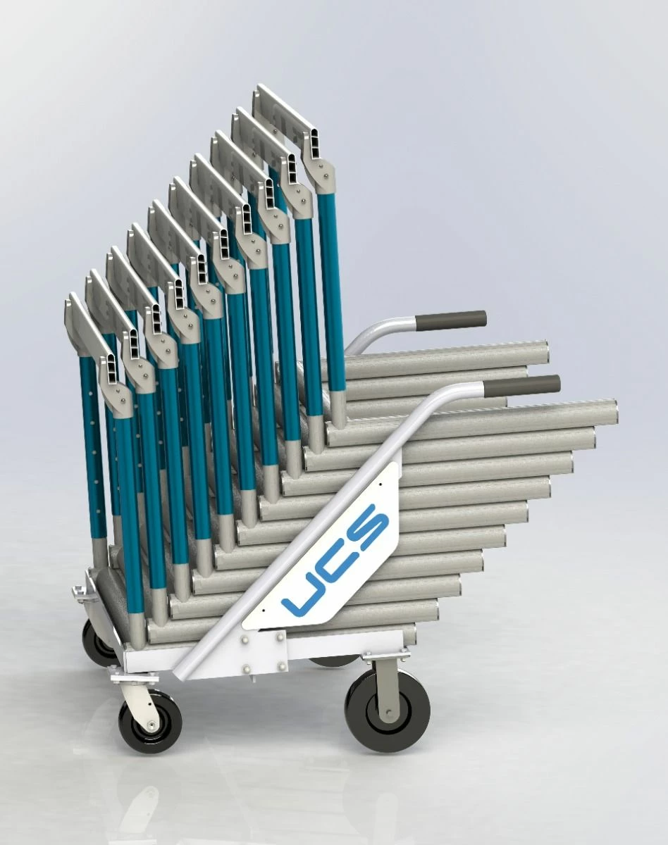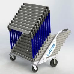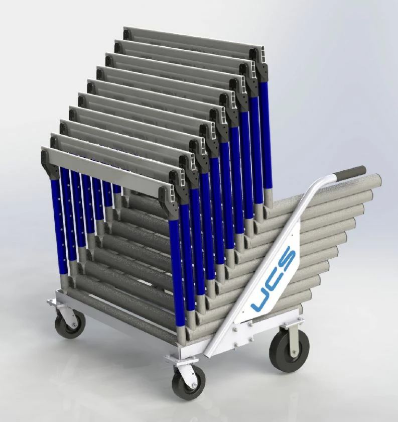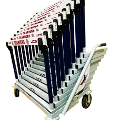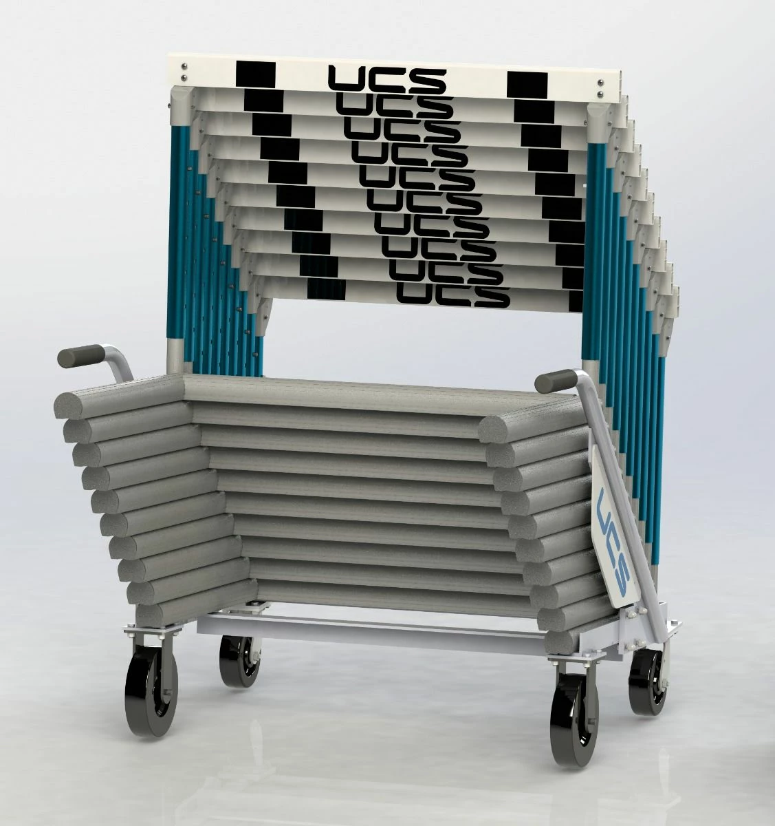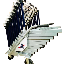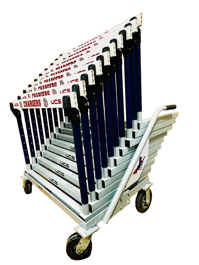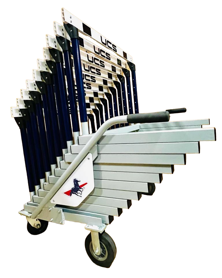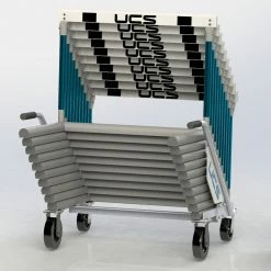 Holds up to 10 hurdles. The UCS Gold Series Hurdle Dolly is compatible with the UCS Ultimate Series and International Series Hurdles. UCS Hurdle Dollies are manufactured out of 0.25″ thick aluminum and equipped with 150 lb rated 5″ diameter casters.