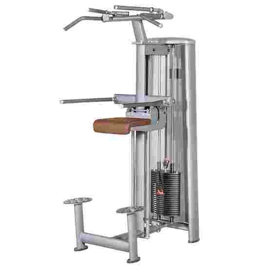 The Sport-Thieme “OV” pull-up machine is perfect for both pull-ups and dips. Particularly practical: the special padding can be easily folded down to make your training easier. You can adjust the weight using the weight stack’s locking pin. The heavier you set this, the easier the exercise is, as the knee pad carries more of your body weight. Well-practised? Then the pad folds upwards allowing you to train using only your own body weight without support.