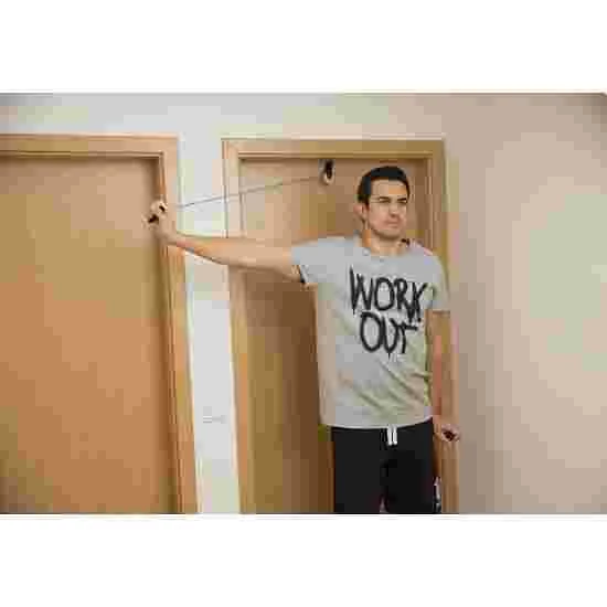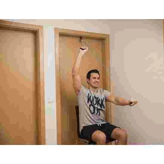 The Sport-Thieme shoulder rope pulley is a compact, convenient fitness device that is easy to use. For improving mobility in the shoulder area, there are many possible applications available to you, ranging from daily fitness training to the prevention or rehabilitation of shoulder injuries. The rope is guided by an easy-running roller. If you pull with one arm, the other arm is automatically moved as well. In this way, you mobilise the entire back and shoulder area with the rope pulley.