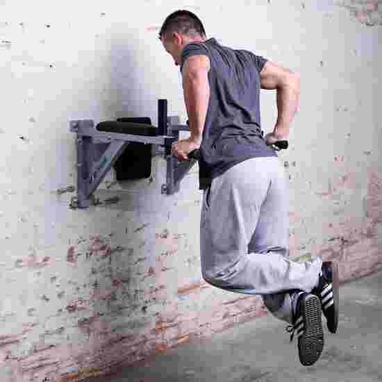 The Sport-Thieme wall-mounted dip station is easy to mount. A key feature of the dip station is its high load capacity of up to 150 kg. The grip sections with tubing material and the back and lower arm padding ensure a comfortable training session. The padding can also be removed. The dip station is made from steel and is therefore very robust and long lasting.