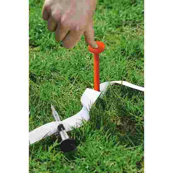 To mark a playing field, simply pull the marking tape off the drum. The tape has openings built into it which allow you to insert the ground anchors to secure the tape. One major plus is the high elasticity of the marking tape – if necessary, you can pull it out to twice its length and mark even larger playing fields. After use, the playing field can be dismantled and stowed away just as quickly. No traces are left on the grass.