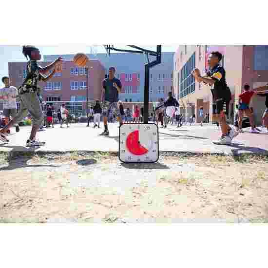 Red section shows the time remaining. New version with dry-erase card for tasks and schedules. The card slides into a holder on the clock. “Pocket” requires 1 AA battery, “Medium” and “Large” each require 2 (not included). End sound can be switched off. LxW (Pocket): 7.5×7.5 cm. LxW (Medium): 18×18 cm. LxW (Large): 30×30 cm.